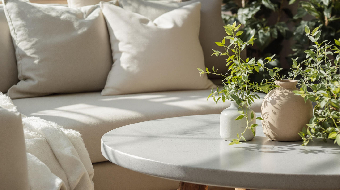 Transformed a residential living room into a nature-inspired haven. Features include expansive windows for natural light, indoor greenery arrangements, and organic textures like linen, wood, and polished concrete to create a peaceful ambiance.