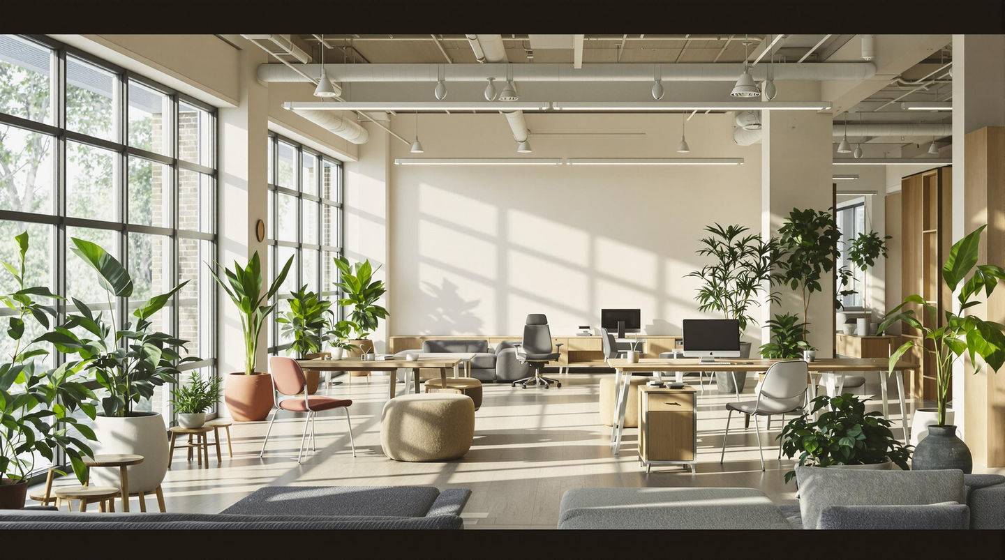A sustainable and modern commercial office space designed for productivity and innovation. Incorporating clean lines, eco-friendly materials, and biophilic elements, the design creates a harmonious blend of urban minimalism and environmental mindfulness, providing an inspiring work environment.