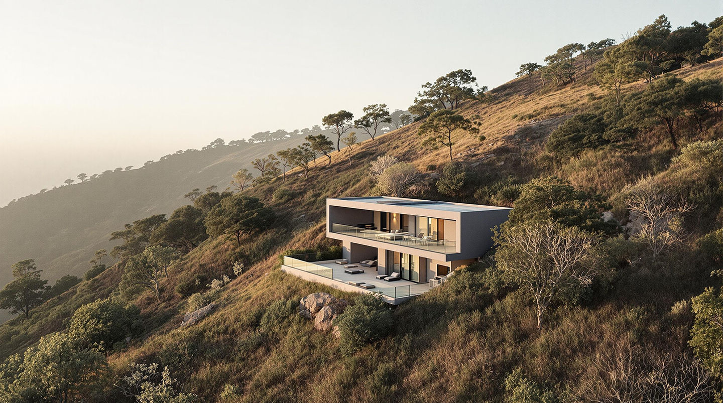 A luxurious private residence nestled in the hills, designed to connect with nature. This project uses a clean, minimalist design with cantilevered forms and extensive use of natural materials. The layout maximizes privacy and panoramic views, offering a serene and refined living experience.