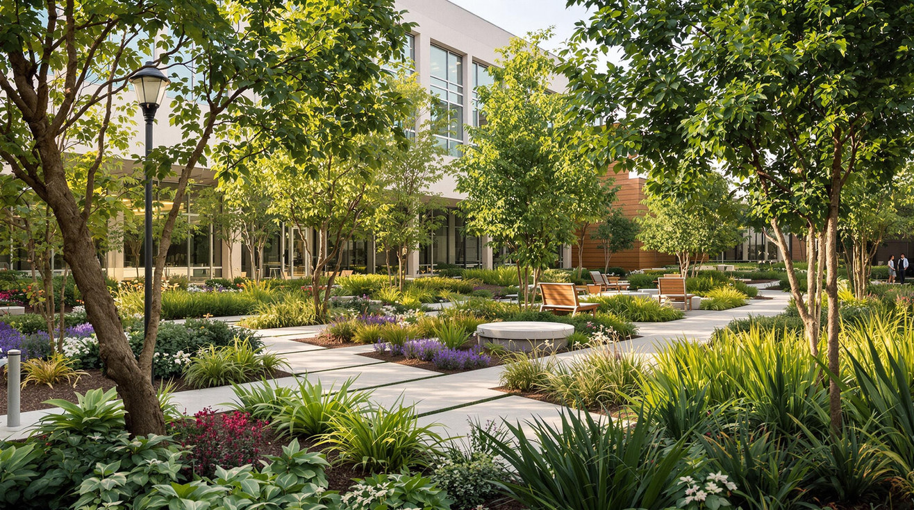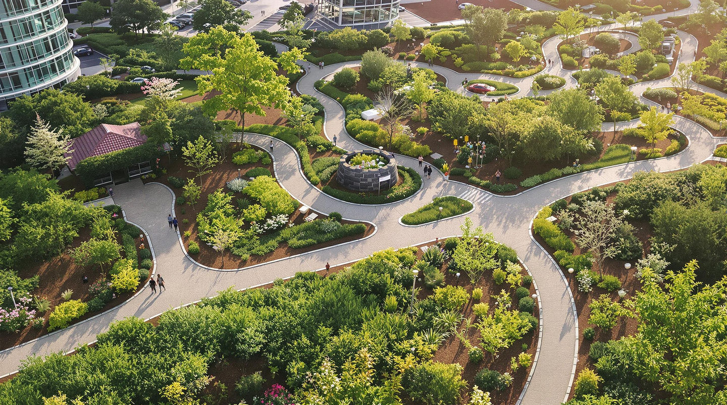 A commercial landscape project designed to bring a touch of nature to a bustling corporate campus. Incorporates shaded seating areas, native plant palettes for sustainability, and pathways lined with eco-friendly materials for employee interaction and rejuvenation.