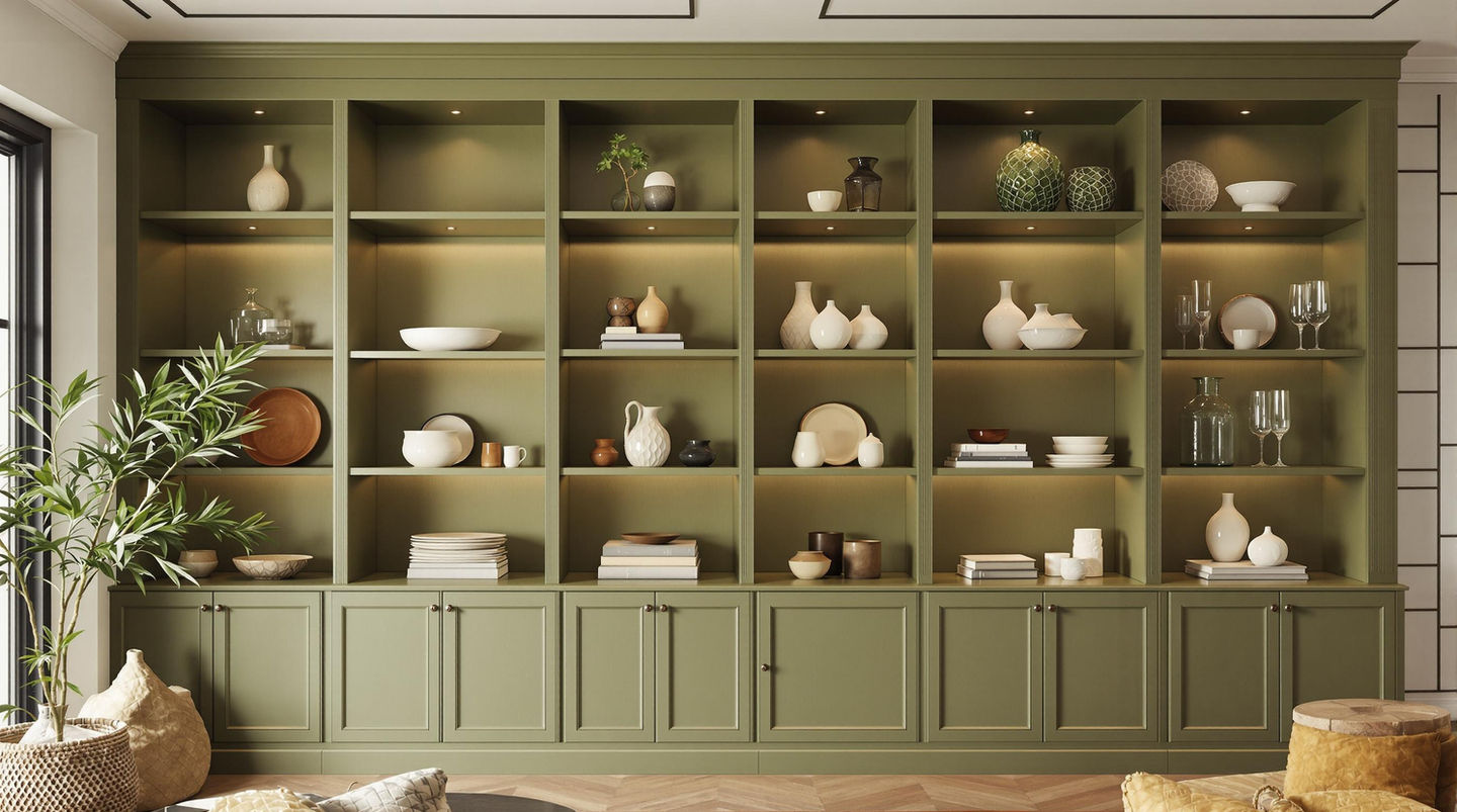 A cozy living room designed with earth tones, incorporating plush beige seating and olive green accents. The layout optimizes natural light flow, while handcrafted textures and custom furniture ensure a welcoming and functional environment.