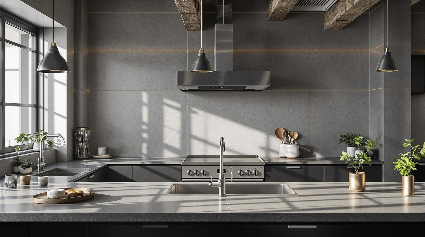 A bold kitchen design blending industrial elements with luxurious finishes. This project highlighted exposed metal accents, concrete textures, and premium stacked appliances. The 3D visualization showcased creative storage options and innovative lighting strategies.